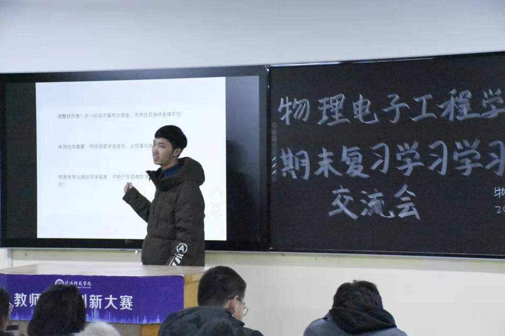 电信班优秀学生代表郭天赐就如何做好期末复习这一话题与在座的各位学子展开深入交流。他引经据典向学子们强调时间的重要性,并引起大家的思考。他表示复习没有捷径可走,但有方法可循。他从自身的学习经历,分享每门学科的学习技巧,做好复习四大环节,提高复习效率,重视期末考试。