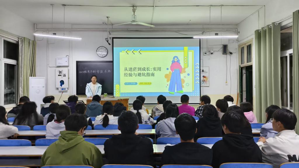 八位学生结合自身学习经历,围绕大学生活适应、学习规划、实践活动参与、学科竞赛等方面为新生提供了实用建议;从课前预习、课上听讲、课后复习、高效利用课余时间等四个方面,讲解了时间管理和高效学习的方法,并强调了在比赛中团队合作与互相激励的重要性,鼓励大家在大学阶段主动探索、共同进步。在互动交流环节,新生踊跃发言,优秀学生代表耐心地为其解答疑惑,现场气氛热烈。