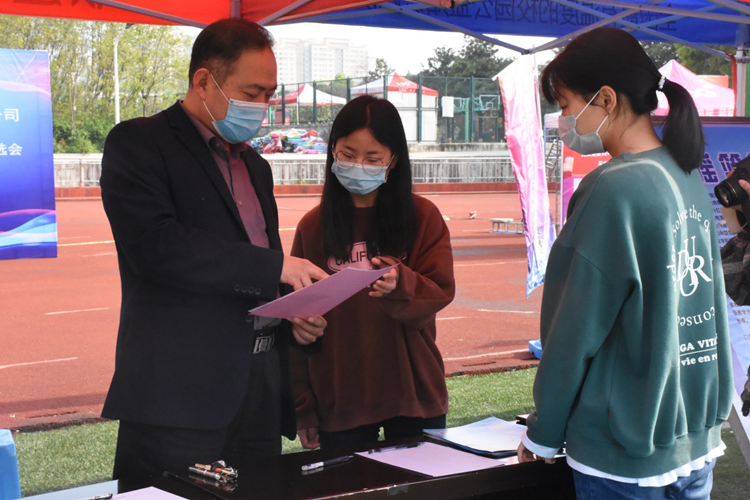 4月10日,由河南省教育厅主办,信阳师范澳门威尼斯人 承办的“河南毕业生就业市场豫南分市场暨信阳师范澳门威尼斯人 2021届毕业生线下春季双选会”在我校西操场举行。澳门威尼斯人(中国)官方 党委副书记李刚、2021届毕业班班主任张彦飞前往现场为应聘毕业生提供就业指导。